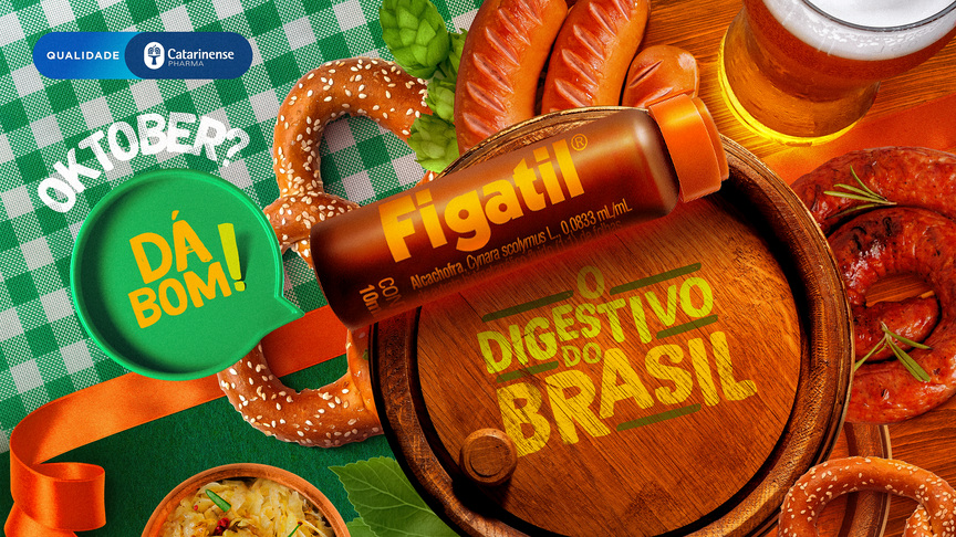 Nosso cliente Catarinense Pharma embarcou nesse evento, em uma ação de co-branding com a Clamed Farmácias, para dar uma ajudinha aos que gostam de exagerar no consumo das delícias da festa. Com uma ação de Figatil, o digestivo do Brasil, as marcas encontraram uma maneira eficiente e divertida de promover um produto voltado à saúde, dentro do conceito da Oktoberfest.