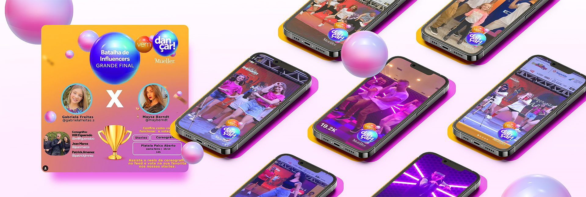 Criamos a Batalha dos Influenciadores, uma ação que aproveitou a tendência das dancinhas da internet para levar o clima do Festival para o digital, através das redes sociais. Com foco no engajamento e na viralização, convidamos oito influencers de Joinville para reproduzirem as danças criadas por cinco coreógrafos da cidade, em cenários dentro do shopping, e publicarem no Reels dos seus perfis do Instagram. O público votou nos favoritos em enquetes interativas nos stories do Shopping Mueller.
